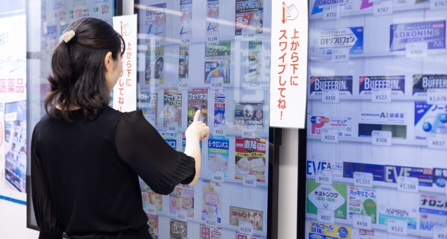 地下鉄博多駅構内の店舗には、デジタルサイネージで一般用医薬品を購入できるシステムを導入。20坪という狭さながら、約700品目の品揃えを実現しています。