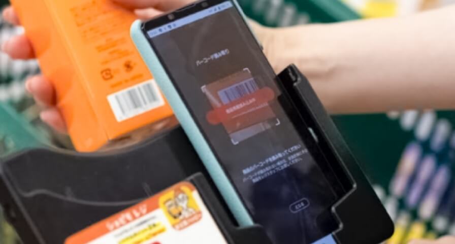 お客様のスマホで商品のバーコードをスキャンするだけで、お会計がスムーズに完了します。スマホレジ利用者限定で、マイバックをセットして使える専用カゴも導入し、より快適にお買い物できる仕組みづくりを行っています。