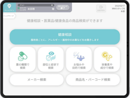 健康台帳は、「正確な商品情報と正確な顧客情報」に基づく「正しいカウンセリング」を実現する接客ツールです。健康台帳の活用により、いつ、どのスタッフに相談しても高品質な健康相談が可能です。