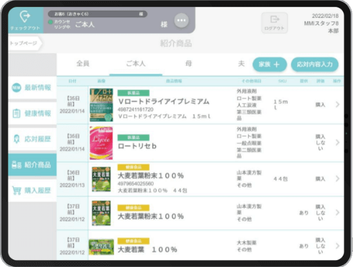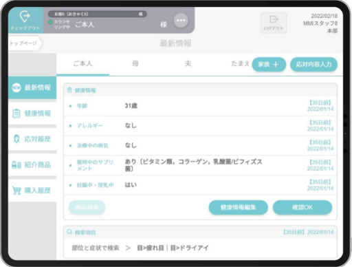 服用される方の年齢やアレルギーの有無、治療中の病気や服用中のサプリメントなど、お客様の健康情報を記録することができます。次回ご来店された際には、ポイントカードをスキャンするだけでお客様の情報を呼び出し、最適な商品をご紹介できます。