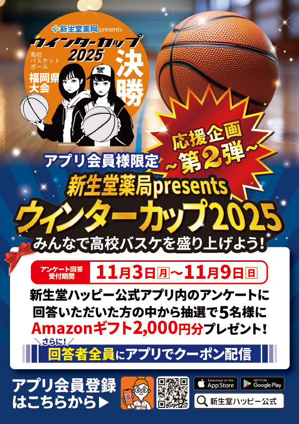 「新生堂薬局presents ウィンターカップ2025 高校バスケットボール福岡県大会 決勝」の開催に伴い、大会を盛り上げるための応援企画第2弾を2025年11月3日(月)から11月9日(日)までの期間、実施することをお知らせいたします。本企画は、新生堂ハッピー公式アプリ会員様限定のアンケートキャンペーンです。