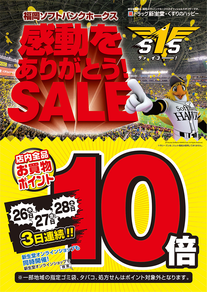 新生堂薬局では、11月26日(木)・27日(金)・28日(土)の3日間、福岡ソフトバンクホークスの日本シリーズ優勝を記念し『福岡ソフトバンクホークスリーグ感動をありがとうセール』として全品ポイント10倍を開催いたします。