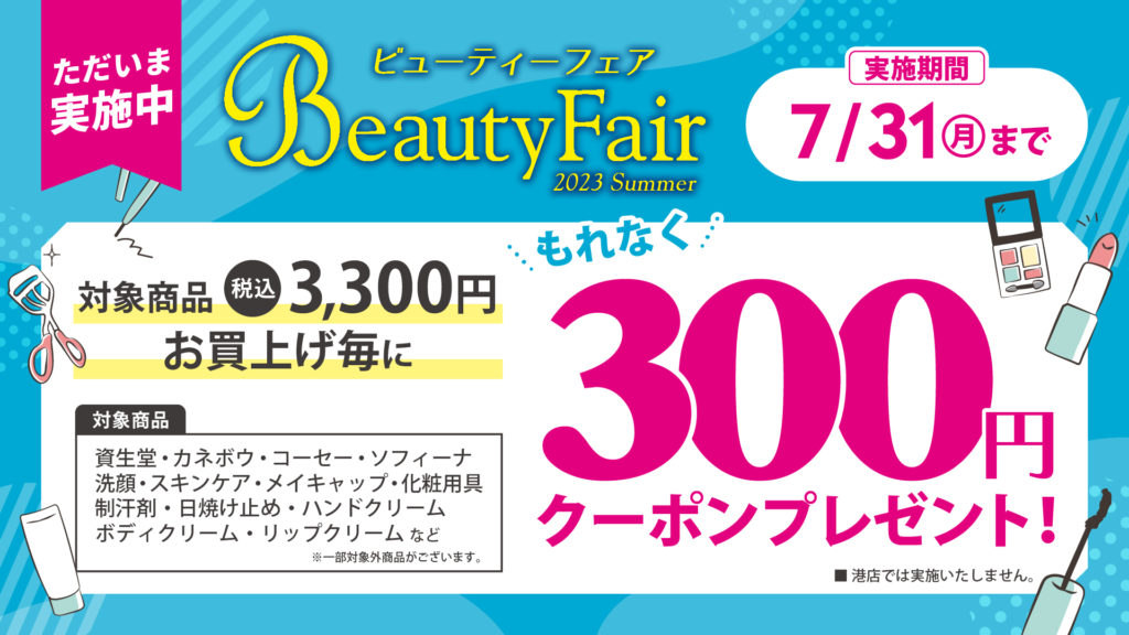 7/1から7/31までの期間中、ドラッグストア店舗全店で「ビューティーフェア 2023 Summer」を開催いたします。(港店を除く)
