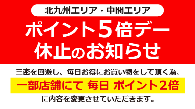 北九州エリアでのコロナウイルス感染者増加を受け、5倍ポイントデーでのお客様の集中を避け、三密を回避する為、また毎日お得にお買い物をして頂く為に、