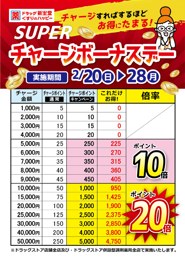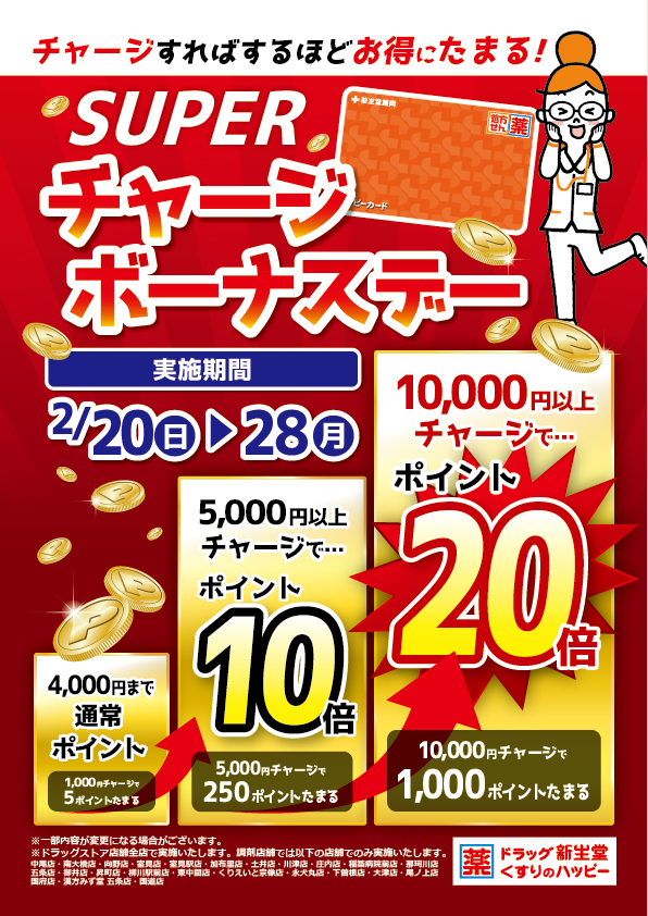 2/20から2/28までの期間中、ドラッグストア店舗全店及び一部の調剤店舗(※1)にて「スーパーチャージボーナスデー」を開催いたします。