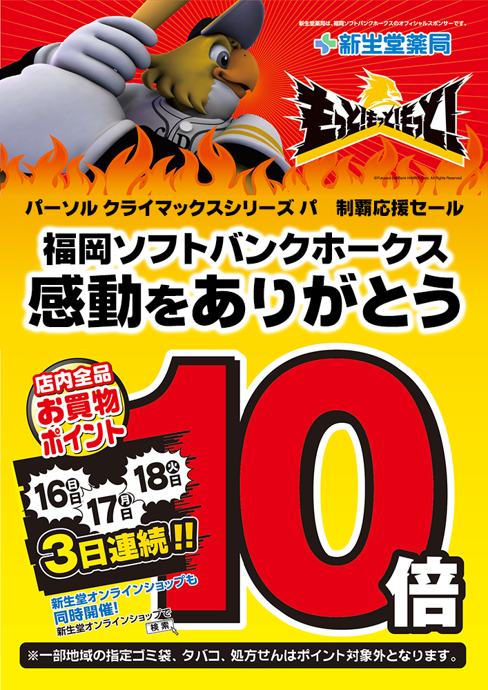 新生堂薬局では、パーソル クライマックスシリーズ パ制覇チーム決定の翌日から3日間、『福岡ソフトバンクホークスCS制覇応援セール』として全品ポイント10倍を開催いたします。