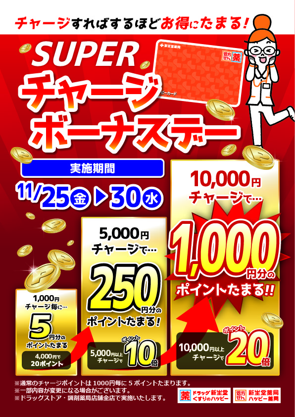 11/25から11/30までの期間中、ドラッグストア及び調剤薬局全店で「スーパーチャージボーナスデー」を開催いたします。
