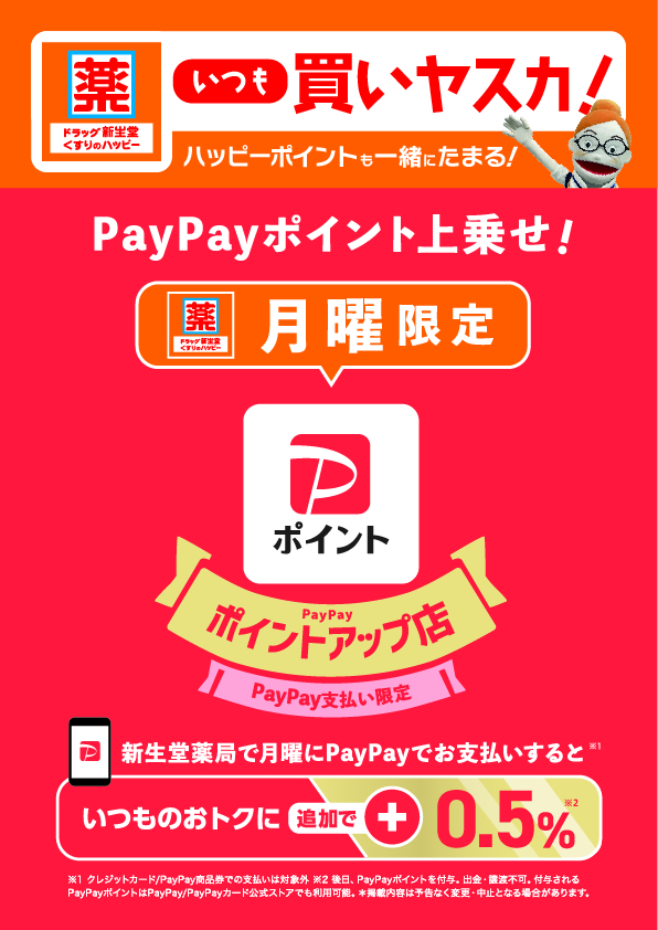 ※「PayPay」の最大付与率2%に「新生堂薬局」、「ハッピー薬局」、「ドラッグ新生堂」、「くすりのハッピー」が付与する「PayPayポイント」0.5%を合算。